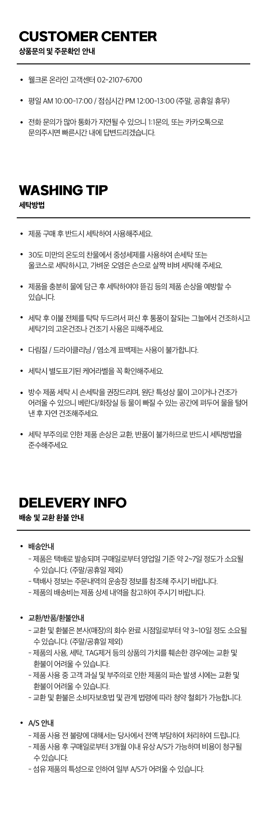 | 품질보증기준 | 세탁 및 사용상품 교환 및 환불 불가능, 텍(TAG)제거시 교환 및 환불 불가능, 구매일로부터 3개월 이내 유상 A/S가능 | ||