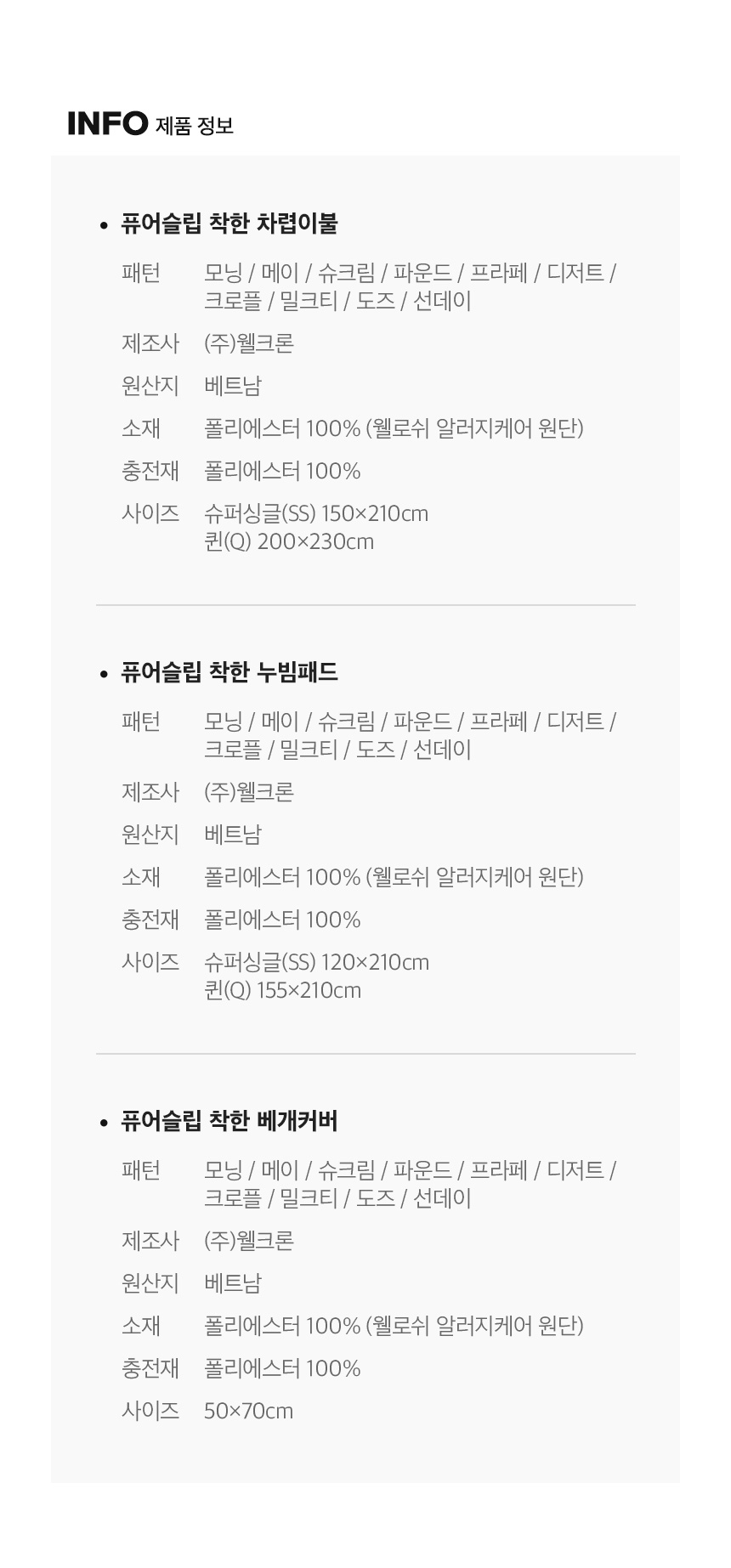 | 제품 소재 | 폴리에스터 100%(알러지케어 인증 원단) | ||
