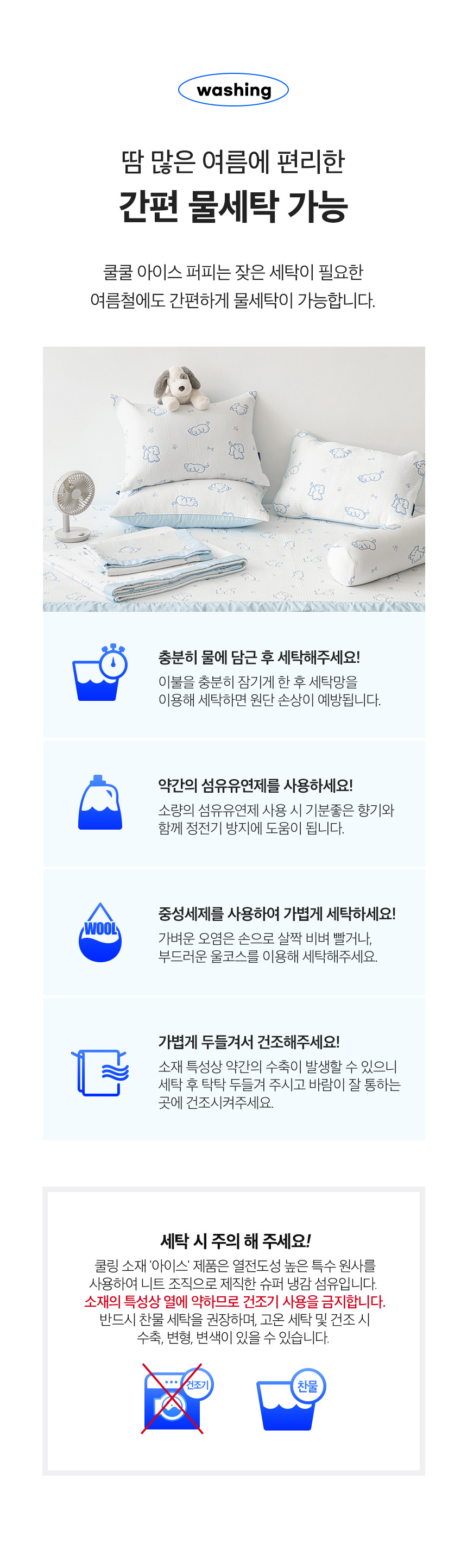 | 세탁방법 및 취급시주의사항 | 단독개별세탁,충분히담구어찬물에세탁,중성세제로세탁기세탁가능,표백제사용금지,드럼세탁기건조금지,화기주의,세탁기파손주의,칼날주의 | ||